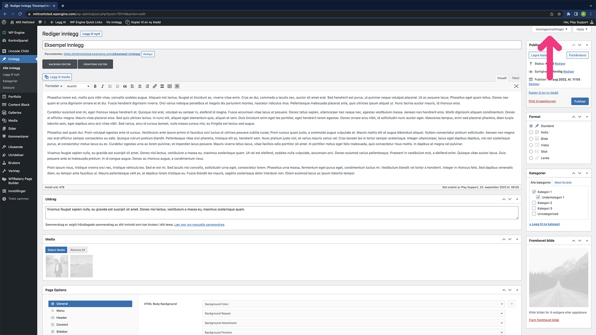 Nedtrekksmenyen «Visningsinnstillinger» finner du på de fleste områder og den er ofte tilpasset hver side du åpner den på. Hva som vises kan variere, og dersom du mangler noen moduler vil valgene her være aktuelle for å vise dem.